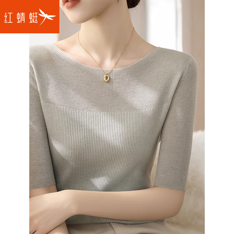 RED DRAGONFLY高级感修身2026春秋新款五分袖针织T恤衫女装上衣中短袖打底 浅灰米中袖 均码 适合80-120斤