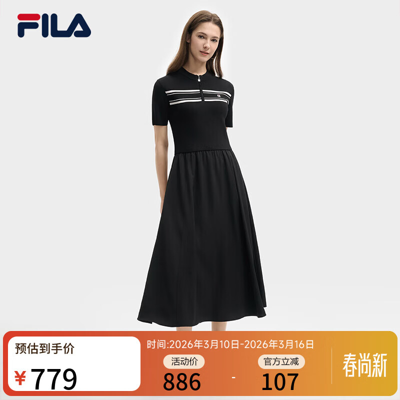 斐乐 斐乐官方女装连衣裙2025夏新款时尚休闲简约修身短袖连身裙子 正黑色-BK S 160/80A/S