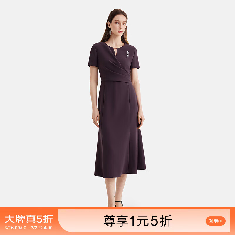 PORTS宝姿女装春夏新款优雅知性立体捏褶领链装饰收腰连衣裙 午夜梅子色-1 L (8)