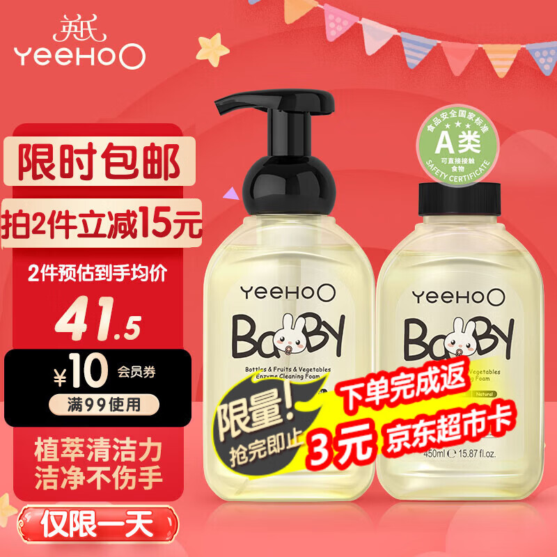 英氏奶瓶清洗剂洗奶嘴果蔬餐玩具婴儿童洗洁精泡沫柠檬酸除垢450ml*2